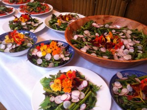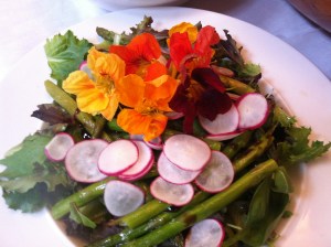 A garden salad of asparagus & radish with nasturtium flowers