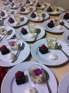 A trio of desserts: Rich chocolate tort, meringue kisses & Elderflower & prosecco jelly